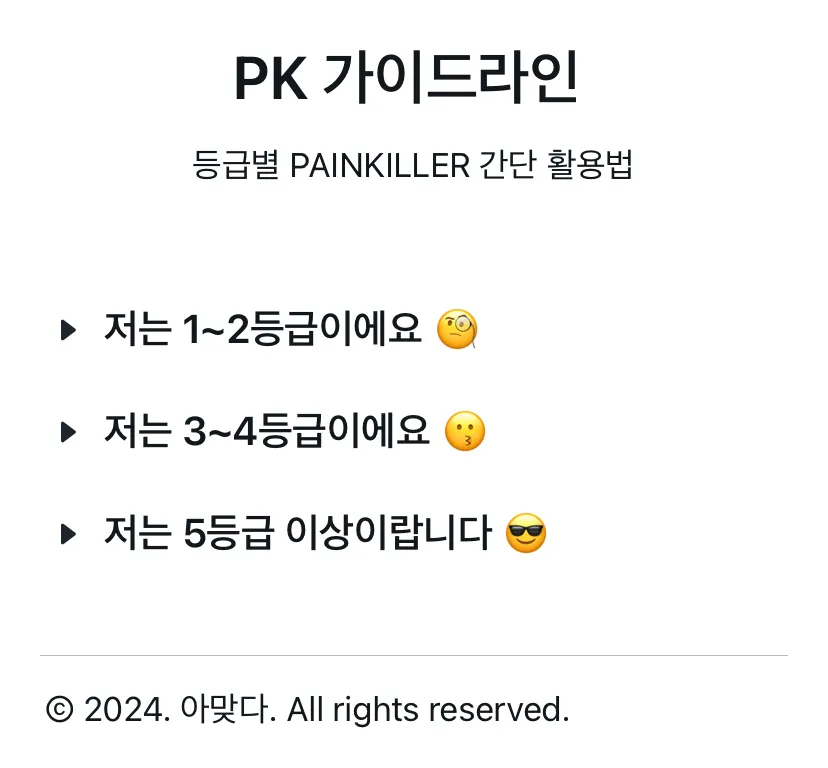 대부분의 단어장은 기출 문장이 예문으로 수록되어 있습니다. 그 예문에는 여러분이 아직 배우지 않은 구문과, 외우지 않은 단어들이 난무합니다. 선생님들은 이 사실을 모를까요? 분명 압니다. 하지만 어쨌든 예문 학습은 도움이 된다고, 최대한 해보라고 추상적인 답변만 쏟아내죠. 도움이 된다는 것만 알지 여러분이 어떤 스트레스를 받는지에 대해서 고민하기에는 너무 바쁘신 것 같습니다. 그래서 저희 아맞다 팀이 PAINKILLER를 통해 문제를 해결해 나가고 있습니다.