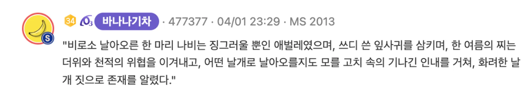 비로소 날아오른 한 마리 나비는 징그러울 뿐인 애벌레였으며, 쓰디쓴 잎사귀를 삼키며, 한 여름의 찌는 더위와 천적의 위협을 이겨내고, 어떤 날개로 날아오를지도 모를 고치 속의 기나긴 인내를 거쳐, 화려한 날갯짓으로 존재를 알렸다.