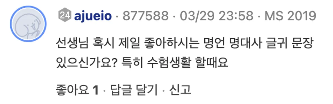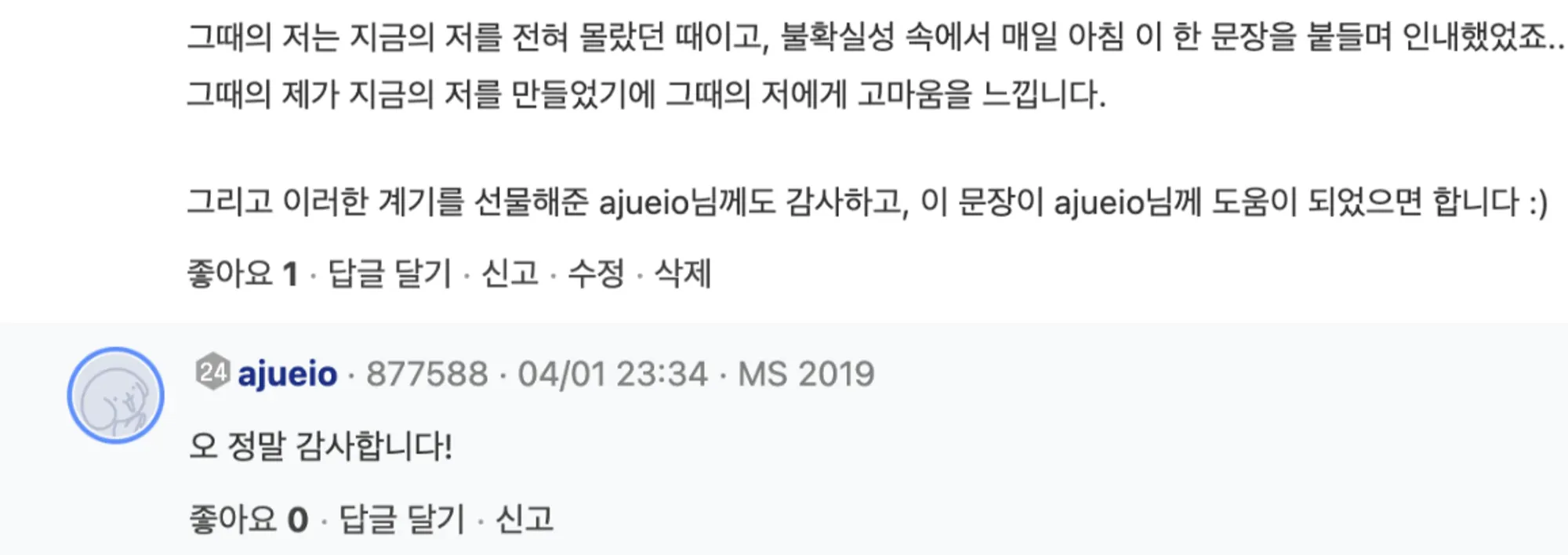 ์ ๋ ์ด ํ์์ ๋๊ธ์ ์ด๋ ๊ฒ ๋ต๋ณ์ ๋จ๊ฒผ์ต๋๋ค.