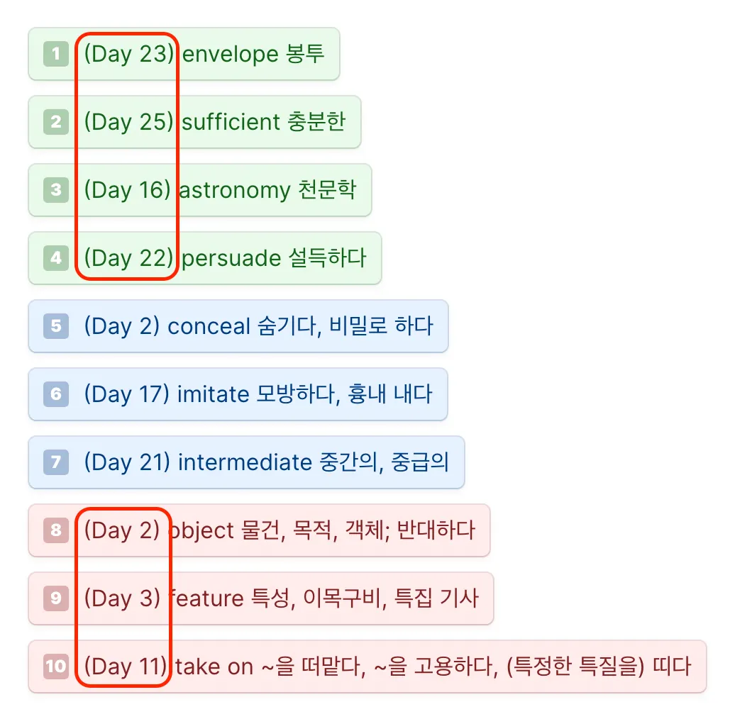 위의 10개의 단어들은 전부 하나의 단어장에 수록된 단어들입니다. 여러분이 제일 앞에 배치시킨 단어들이 실제 단어장에는 어디에 배치되어 있는지 보이시나요? 그리고 여러분이 제일 뒤로 배치시킨 단어들이 실제 단어장에는 어디에 배치되어 있는지 보이시나요?