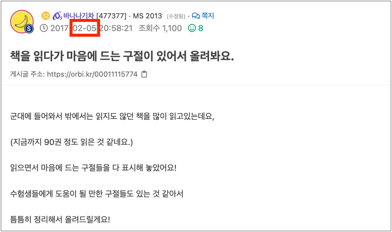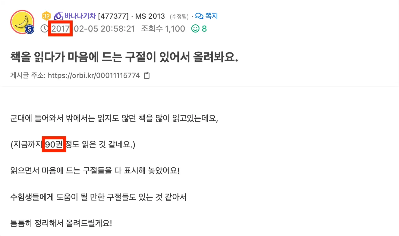 위 글을 쓴 시점(17년)은 제가 입대한 지 441일째 되는 날이었습니다. 441일 동안 매일 책을 읽을 수 있는 환경은 아니었지만, 그렇다고 쳤을 때 90권을 읽은 것이면 평균 5일이 되지 않는 시간 동안 책을 한 권씩 읽어냈다는 계산이 나옵니다. 그리고 이 글을 쓴 이후에 전역하기까지 260일 동안 60권의 책을 더 읽었죠.