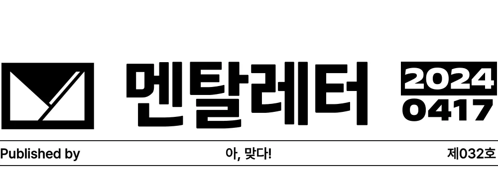 Ⓒ 2024. 아맞다. All rights reserved. 상업적인 목적으로의 이용은 엄격히 금지됩니다. 멘탈레터의 일부 또는 전체를 상업적인 목적으로 임의로 이용, 변형, 또는 배포(공유)하는 행위는 저작권 침해로 간주됩니다.