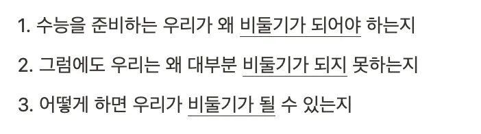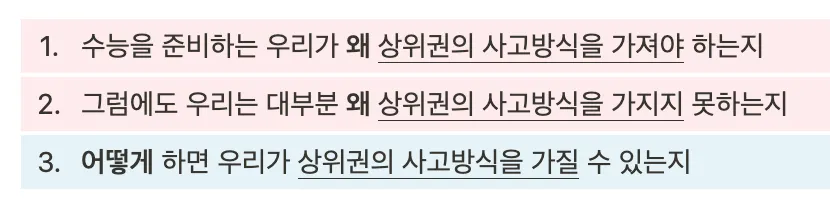 여러분이 유튜브, 수험생 커뮤니티 등으로부터 상위권들이 성장할 수 있었던 공부법을 듣고 접해도 이전과 확연히 달라지지 못하고 제자리로 돌아오게 되는 이유가 무엇일까요?