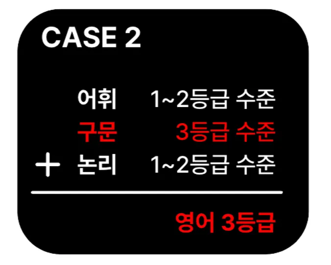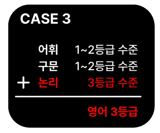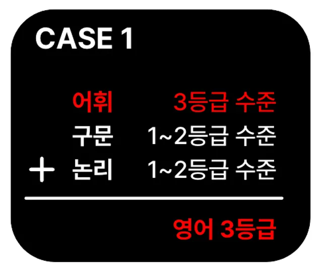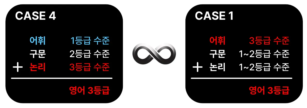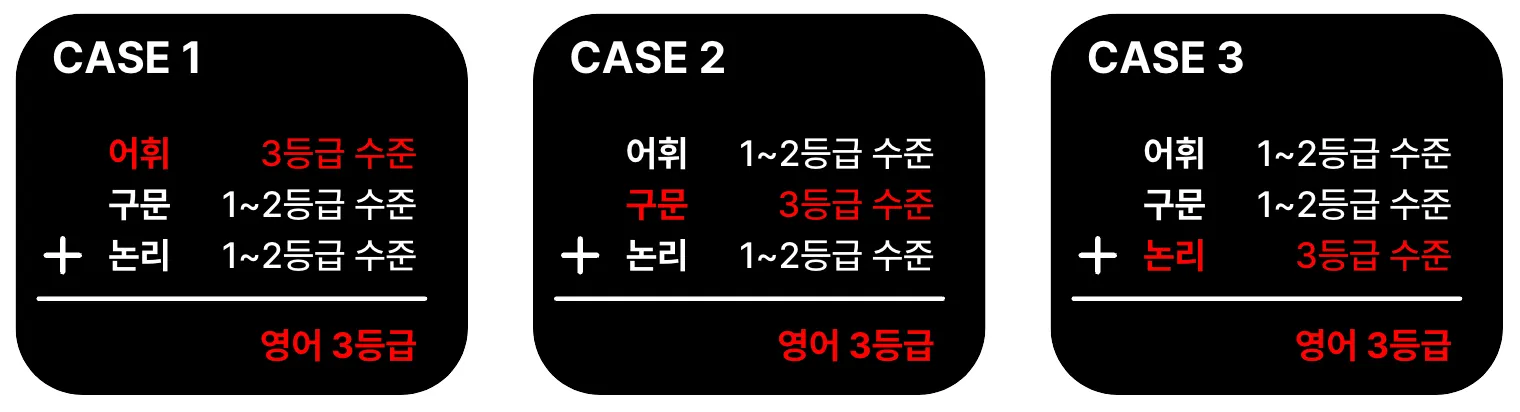 위 이미지에 보이는 CASE 4에 해당하죠. 그러면 어휘를 1등급 수준으로 끌어올려도 결국은 3등급을 받습니다. 그래서 다시 구문과 논리에 집중하면 어휘에 소홀하게 되어 CASE 1로 회귀하게 됩니다. 그리고 이걸 계속 반복합니다. 결과적으로 영어 3등급에서 벗어나지 못하게 돼죠.