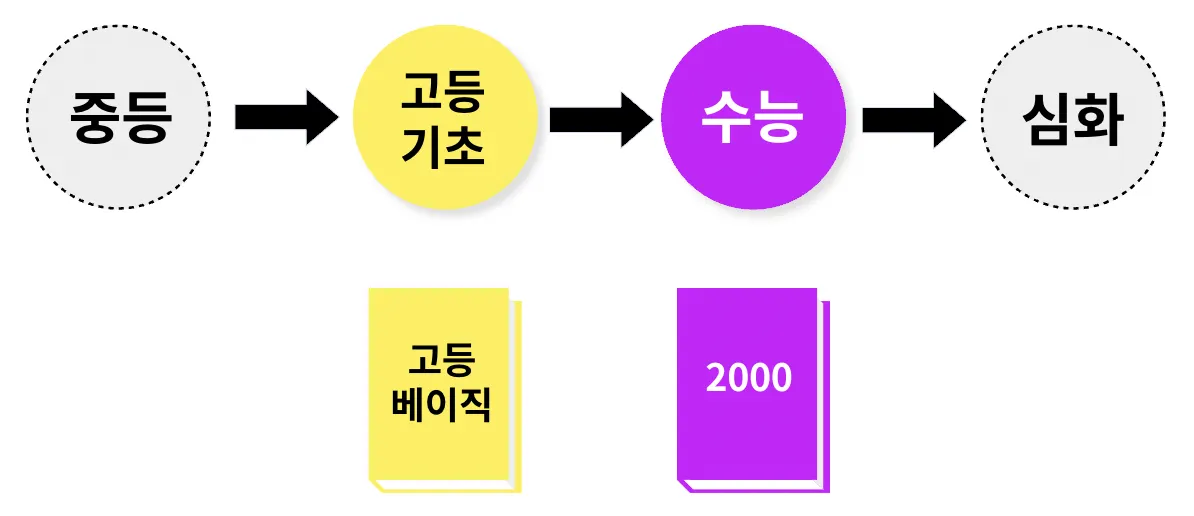 A. 아뇨, 가장 대중적인 단어장을 예시로 들었을 뿐입니다. 여러분이 가지고 있는 단어장이 시리즈 유형이라면 해당 시리즈에서 고등 기초와 수능 수준에 해당하는 단어장 두 권을 외워주시면 됩니다.